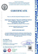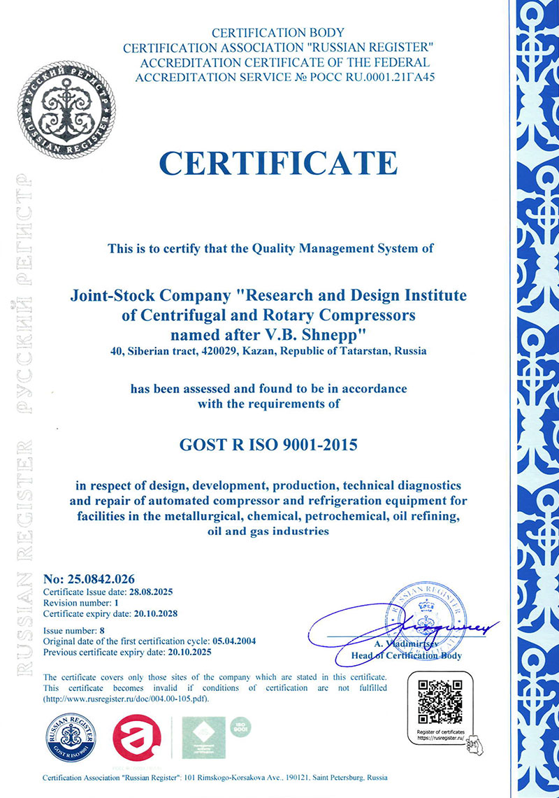 The company works in compliance with modern Russian and international quality management system standards, which is confirmed by relevant certificates. Integrated management system of Kazancompressormash is certified against the compliance with the requirements of ISO 9001: 2008, ISO 14001: 2004, OHSAS 18001: 2007 (quality management, environmental management and occupational health and safety management system), as well as with the requirements of GAZPROM quality management system.