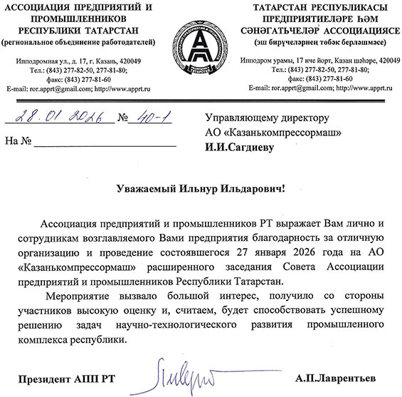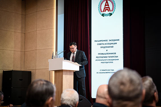 27 января 2026 года на базе АО «Казанькомпрессормаш» состоялось расширенное заседание Совета Ассоциации предприятий и промышленников Республики Татарстан, в котором приняли участие заместитель Премьер-министра Республики Татарстан – министр промышленности и торговли РТ О.В. Коробченко, министр труда, занятости и социальной защиты РТ Э.А. Зарипова, а также руководители предприятий – членов АПП РТ.